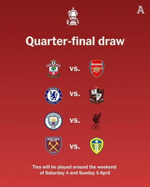 南安普顿(英冠第8)vs阿森纳,不得不说阿森纳继欧冠之后,足总杯也是好签运,踢个英冠球队,阿森纳可以轮换阵容,蓄力英超和欧冠争冠。 切尔西vs维尔港(英甲第24,第三级别联赛),切尔西上上签,遇上英甲副班长,这对于蓝军而言,或许就是送分题。 曼城vs利物浦,曼城运气是真背,欧冠1/8决赛抽到皇马,足总杯1/4决赛抽到利物浦,都是下下签,要想晋级,必须全力以赴,这会影响曼城在英超和欧冠的争冠局势。 西汉姆联vs利兹联,英超保级球队之间的对决,或许对于铁锤帮而言,英超保级才是第一任务,足总杯或许会适当放弃。